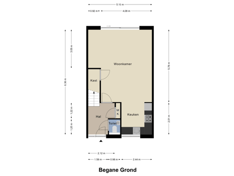 Ruime ontvangsthal met meterkast, garderobe en de toiletruimte. Vanuit de hal zijn de woonkamer en de trapopgang naar de verdieping toegankelijk. De gehele begane grond is afgewerkt met een laminaatvloer.