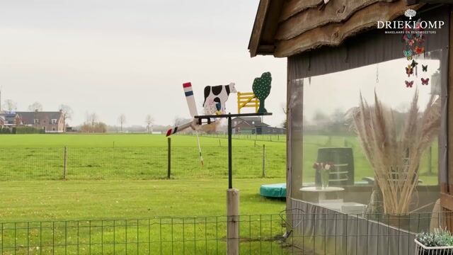 Via de mooie, met klinkers aangelegde oprit bereikt u het erf, omzoomd door houtsingels en prachtig uitzicht over de omliggende landerijen. De gevel met klassieke luiken en de kenmerkende bouwstijl van voor- en achterhuis geven de woning een warme, authentieke uitstraling.