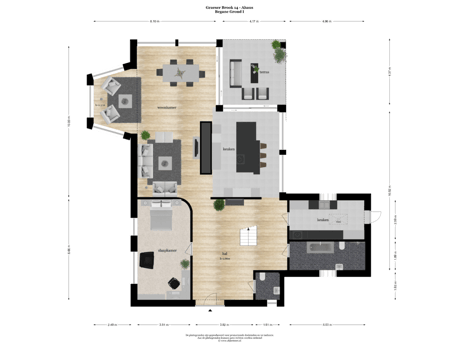 The entire ground floor is adorned with expansive floor-to-ceiling triple-layered windows equipped with UV filters. Inside, the windows feature elegant wooden frames, while the exterior showcases low-maintenance aluminum casings. This ensures an abundance of natural light and breathtaking views while seamlessly combining aesthetic appeal with durability. With a generous living area of 621 m², the estate offers every conceivable comfort. The beautiful living room features a stylish bio-ethanol fireplace and an adjoining terrace, ideal for relaxation and entertaining. The spacious kitchen is a chef’s dream, with ample storage, high-end appliances, and thoughtfully integrated accessories that make cooking a delight.