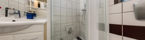 - Walk-in shower, toilet, and washstand