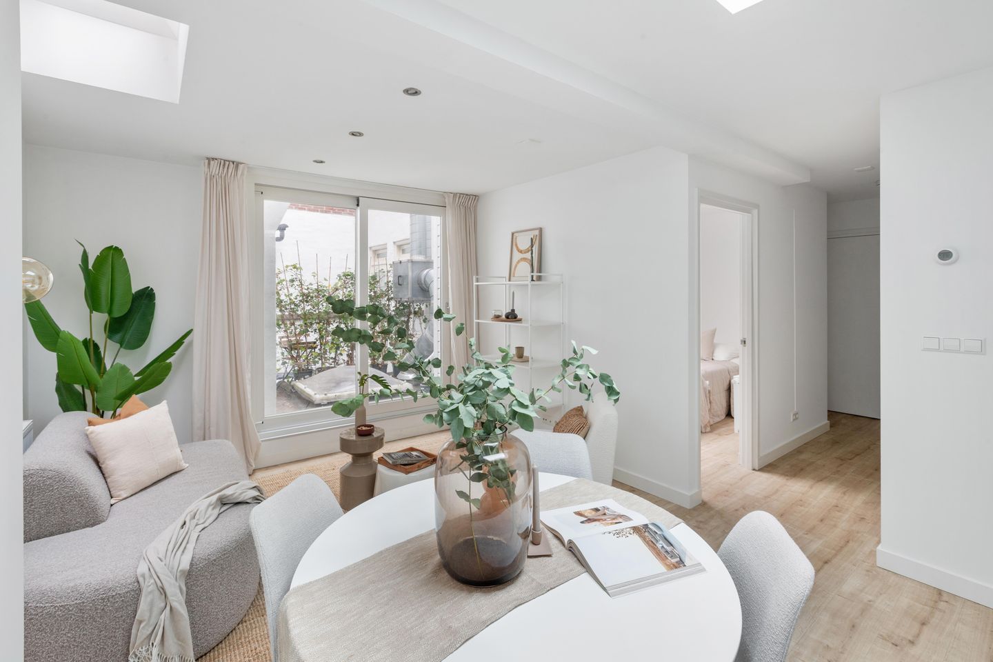Dit appartement bevindt zich aan de rustige achterzijde, waardoor je binnen veel privacy hebt. Achter de voordeur is de lange hal, die in open verbinding met de woonkamer en keuken staat. De vloer met subtiel houtpatroon ligt in bijna het hele appartement en de muren zijn, net als de plafonds, strak afgewerkt.