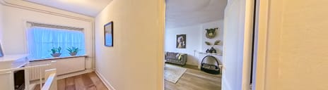 Eenmaal binnen loop je, met de trap, naar de eerste verdieping. Hier is de voordeur van deze instapklare maisonnette. Kom je mee om de binnenzijde te bewonderen?