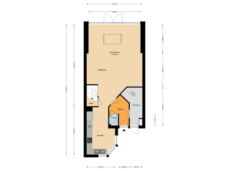 - 75 m² (15.00 metre deep and 5.00 metre wide)