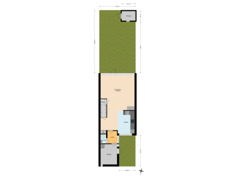 Via de betegelde voortuin bereiken we de voordeur van de woning met links daarvan toegang tot de aan de woning geschakelde berging. Achter de voordeur vinden we entreehal met de garderobe, inpandige toegang tot de berging, het gastentoilet met fonteintje en de toegang tot de woonkamer met open keuken.