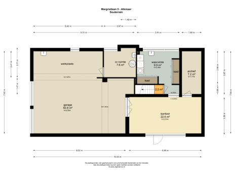 Het souterrain vormt een volwaardige extra woonlaag en biedt tal van gebruiksmogelijkheden. Hier bevindt zich een royale werk- of slaapkamer van circa 23 m² met directe toegang tot het terras en de tuin, ideaal als kantoor aan huis, hobbyruimte of logeerkamer. Daarnaast is er een praktische bijkeuken met aansluitingen voor wasmachine en droger, voorzien van vaste kasten en extra bergruimte. Verder zijn er meerdere bergingen aanwezig, een technische ruimte met de opstelling van de cv-installatie en hybride warmtepomp, en een royale dubbele garage met geïntegreerde werkruimte van circa 61 m². De garage is ruim van opzet en biedt plaats aan meerdere voertuigen, fietsen of opslag, waarbij één van de garagedeuren elektrisch bedienbaar is. Dankzij de directe toegang tot de tuin en het terras is het souterrain niet alleen functioneel, maar ook verrassend licht en prettig in gebruik.