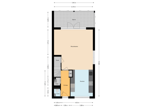 Upon entering through the front door, you first arrive in a spacious entrance hall. On the left, you will find the doors to a separate toilet room (with a wall-mounted toilet and a small sink) and a custom-built closet with a boiler. The staircase and the meter cupboard are also located in the hall. Furthermore, there is a beautiful laminate floor that seamlessly continues into the spacious living room. Thanks to the large rear windows (facing southeast) and the additional side windows (southwest), this area benefits from plenty of (sun)light. At the front of the living area, you will find an open kitchen consisting of two full kitchen units along the wall. Here, you can make use of high-quality built-in appliances such as a dishwasher, oven, induction hob with worktop extractor, refrigerator, freezer, and hot/cold water tap. All built-in appliances are from the premium brand Siemens.