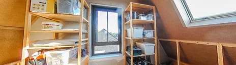 When you arrive on the top residential floor, you first enter a landing. Here, behind the door to the left, you will find a first large attic bedroom. Furthermore, from the landing, you can access a storage room, as well as a hallway that provides access to the fifth spacious bedroom of the house. In the mentioned hallway, in addition to the heat pump, there are also hookups for both a washing machine and a dryer. The walls and floor still need to be finished. A staircase from the landing leads to a practical storage attic.