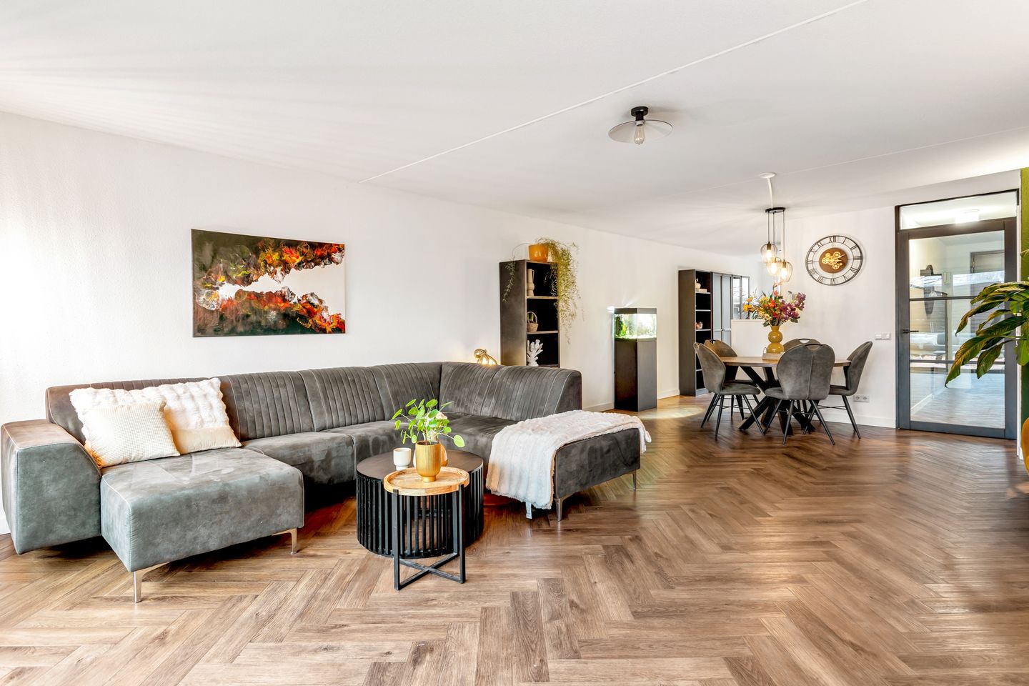 De woonkamer van maar liefst 39 m² is tuingericht en door de schuifpui met grote raampartijen treedt het licht goed de woning binnen. De schuifpui geeft toegang tot de achtertuin.