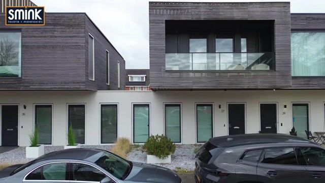Aan de achterzijde bevinden zich twee slaapkamers met toegang tot het ruime balkon, afgewerkt met vlonders en een moderne glazen balustrade met zwarte stalen details, perfect passend bij de stijl van de woning.