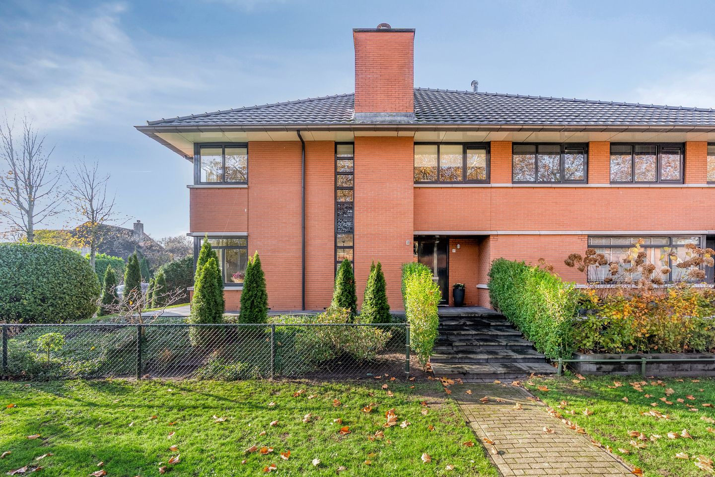 The semi-detached villa at number 17 is a perfect example of this. Behind the stately façade—finished in red-blended brickwork with horizontal detailing and generous roof overhangs inspired by Frank Lloyd Wright—lies a spacious and light-filled home with 148 m² of living space and a volume of 590 m³. Its position on the plot, the wide side garden and the sightlines towards the rear garden give the property an especially open and tranquil character.