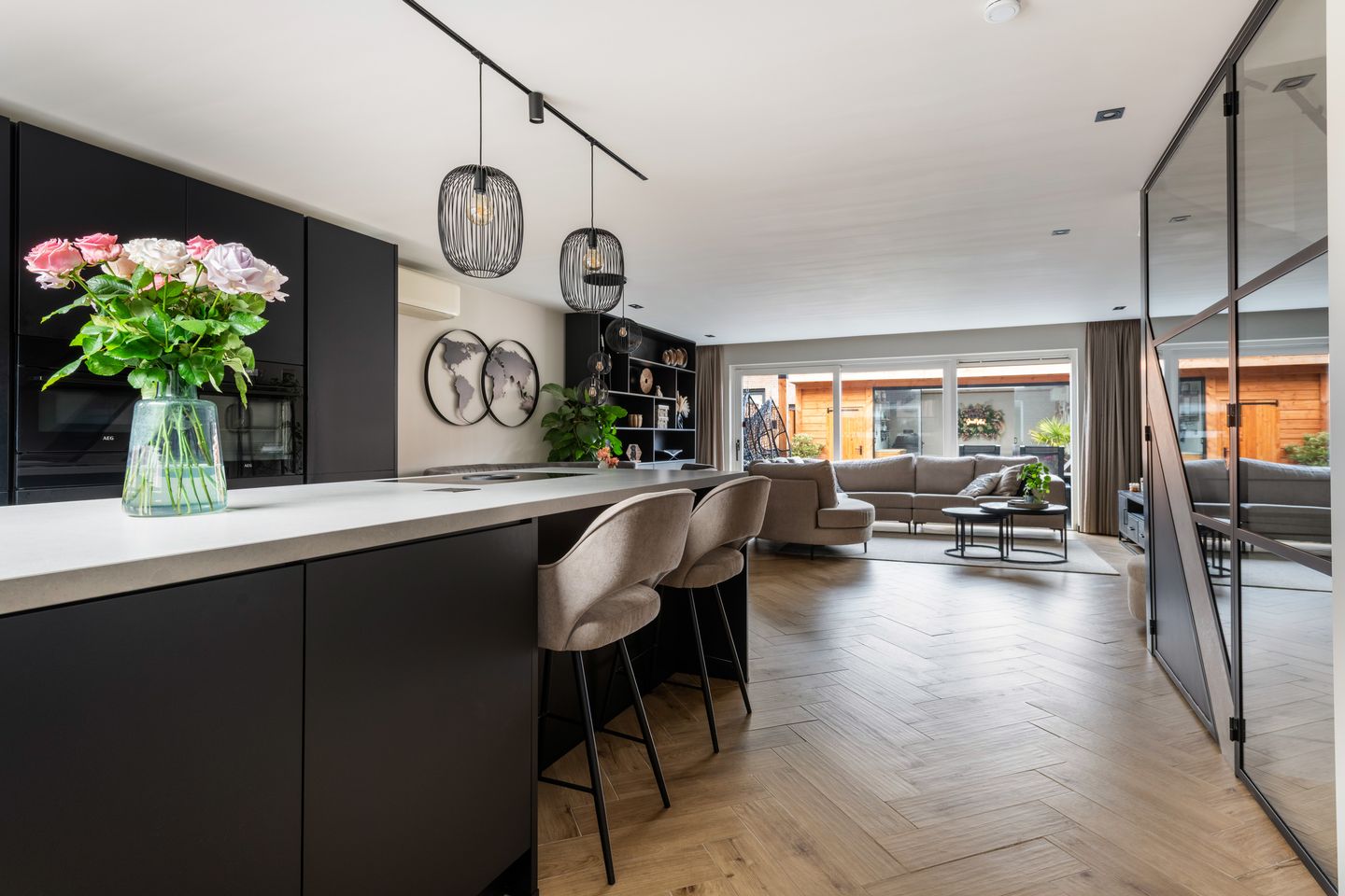 De open keuken vormt het hart van de woning en is uitgevoerd met een stijlvol kookeiland. De keuken is uitgerust met uitsluitend hoogwaardige AEG-apparatuur, waaronder een Bora kookplaat met geïntegreerd afzuigsysteem, een combi-magnetron en een vaatwasser. Ook is er een quooker kraan met warm en waterkoeler aanwezig. Een keuken die niet alleen mooi is, maar ook praktisch en compleet.