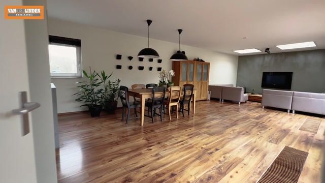 Via the driveway with ample parking space, you reach the indoor storage room and the entrance of the house. The hallway contains the meter cupboard, a toilet with washbasin, and access to the storage room. The corridor leads to the sitting area and the very spacious living room, where large windows provide a pleasant influx of natural light, enhanced by two large skylights above the seating area. Through the sliding doors, you step directly into the sunny, sheltered patio—a wonderful place to relax.