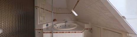 Eerste verdieping: Overloop, trapopgang, zeer ruime badkamer met een zeer royaal ligbad, inloopdouche en een dubbele wastafel, De wasruimte was voorheen de badkamer en is ook nog voorzien van een toilet. Verder op deze verdieping een royale slaapkamer met airco en een dakterras.
