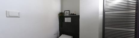 De badkamer is modern en stijlvol, met een combinatie van grote, antraciet vloertegels en witte wandtegels tot aan het plafond. Hier kun je alle zorgen van de dag van je afspoelen onder de ruime inloopdouche met regendouche. Ook vind je hier een dubbele wastafel met meubel en een verlichte spiegel, een vrijhangend toilet, een designradiator en een raam voor natuurlijke ventilatie en lichtinval.