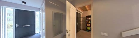 Upon entering, you are immediately struck by the very spacious hall with a beautiful open staircase, hardwood stairs, toilet and cloakroom. The spacious living room extends across the entire width of the house and features large windows and French doors that offer a view of the garden.