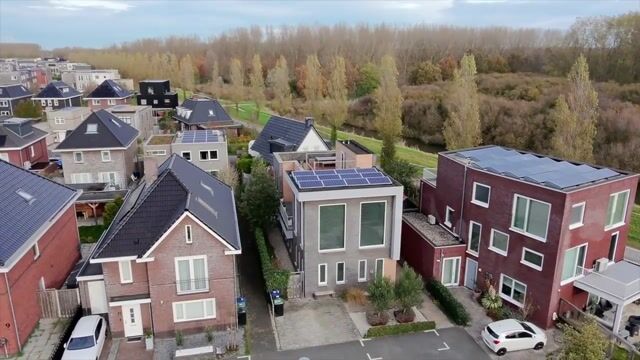 The house was designed by Almere architect Olof van de Linden and is fully equipped with plastic window frames, triple glazing, 12 solar panels (2019), and modern, sleek finishes such as smooth plastered walls and cast floors. There is comfortable parking for two cars on the property.
