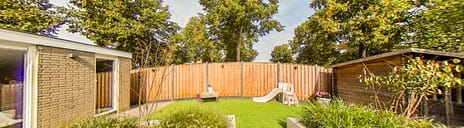 De achtertuin ligt op het noordoosten en is onderhoudsvriendelijk aangelegd met een keurige bestrating, borders en een stukje kunstgras. Verder vind je hier een houten berging en een achterom via de zijsteeg, ideaal voor fietsen. De tuin is omheind met een nette houten schutting met betonnen palen. Geniet van het zonnetje doe je hier de hele dag!