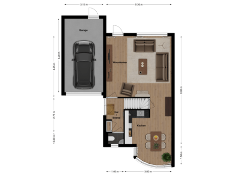 De stenen garage naast het huis heeft voor een elektrische sectionaaldeur en achter een gewone deur. Binnen is verwarming aanwezig én een uitstortgootsteen. De garage is gebouwd met een betonvloer, halfsteens metselwerk en een bitumen dak. Afmetingen: ca. 6.00 x 3.15 meter.