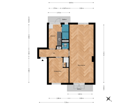 Op de 3e verdieping aangekomen is er toegang tot het appartement. Je stapt binnen in de hal met hier de mogelijkheid voor de kapstok en de meterkast. Ook is er toegang tot de keuken, de slaapkamer, de toiletruimte en de doorzon woonkamer.