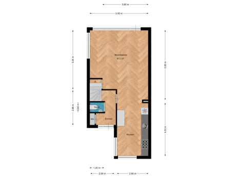Bij binnenkomst betreedt u de ruime entree van de woning. Hier vindt u de meterkast en is er voldoende plek voor een garderobe om jassen en schoenen op te bergen. Vanuit de entree heeft u toegang tot het toilet, de trapopgang naar boven en de woonkamer met open keuken.