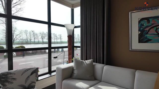 Via the driveway, you reach the front door and the spacious entrance hall, which features a wardrobe, toilet, and staircase to the upper floor. The living room is located at the front of the house and offers breathtaking views over the Amstel. Large windows allow an abundance of natural light to flood in, while the motorized curtains can be operated via an app. Luxaflex Silhouette blinds (motorized, with memory function) are also installed here. The stylish black tiled floor with underfloor heating, built-in dimmable Modular spotlights, and large custom-designed cabinets complete the space.