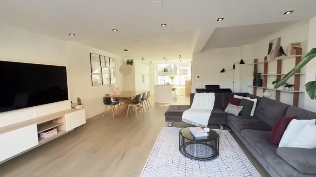 The extended living room of approximately 30 m² forms the heart of the home and offers a bright and comfortable living space. Large windows provide plenty of natural light and create an open atmosphere. Sliding doors give direct access to the sunny east-facing garden. The ceiling features stylish recessed lighting, and the space is finished with a beautiful laminate floor with underfloor heating, providing additional comfort.