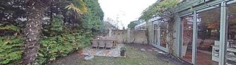 After construction, the garden was completely redesigned and established as a fully green space (no paving) at both the front and rear of the property. The garden is enclosed by a fence with a separate gate—strategically placed on the side next to the front garden—which ensures optimal privacy, enhanced by the tall conifers. A highlight is the impressive palm tree in the back garden, where a cozy lounge and dining area has been created.