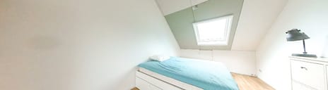 Spacious attic with skylights at the front and a dormer window at the rear. This space is suitable as a bedroom, office, or hobby room. Connections for a washing machine and dryer are also located here.