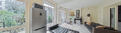 Entree in de charmante hal met originele tegels. De fantastische woonkamer met open keuken ademt ruimte en licht! De ruimte kenmerkt zich zowel door de hoogte á 3,2m als de breedte á 8m. De grote raampartijen en twee sets openslaande deuren bieden een uitzicht op de 15 meter diepe stadstuin. De moderne keuken is volledig gemaakt van roestvrij staal. Aan de voorzijde bevindt zich een en suite kamer die af te scheiden is door de originele glas in lood deuren. Er is een tweede kamer aan de voorzijde die perfect fungeert als werk- of hobby kamer.