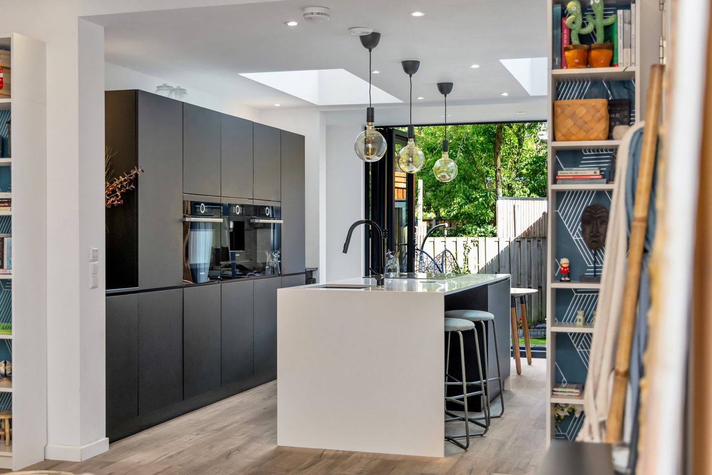 De eethoek in de uitbouw ligt onder een fraai skylight dat zorgt voor veel natuurlijk licht en een open gevoel. Dit maakt het een fijne plek voor lange diners, thuiswerken of een ontspannen ochtend aan tafel.