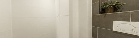 The bathroom is centrally located in the apartment and was renovated in 2019. The room is fitted with a shower, washbasin and toilet. The walls are tiled in white and grey, and the floor features a grey floor tile.