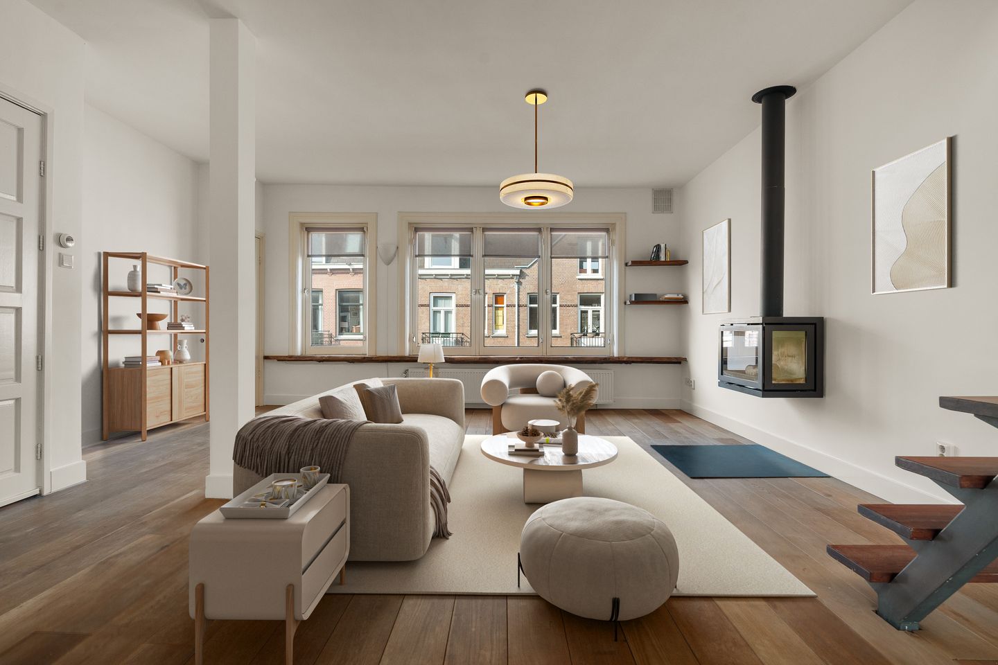 On the third floor you will find a light and spacious through-apartment with an optimal layout and American oak wooden flooring. This floor has a spacious open kitchen at the rear with room for a large dining table. The three balcony doors provide direct access to a balcony that spans the full width of the apartment with a view of the quiet inner garden. The spacious and cosy living room has a beautiful Dik Geurts wood-burning stove, which provides extra warmth and cosiness in the colder months. Thanks to the open-plan design and large windows, the entire living space benefits from an abundance of natural daylight. In addition, this floor has a spacious bathroom with both a bathtub and a walk-in shower, and again an abundance of natural light.