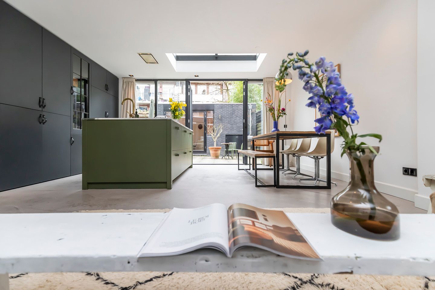 De sfeervolle woonkamer heeft een betonnen vloeren en op maat gemaakte kasten. De keuken is een waar pronkstuk: een maatwerk designkeuken met een marmeren werkblad, twee koelkasten, een extra breed SMEG-gasfornuis met zes pitten en een in het plafond geïntegreerde afzuigkap. De kraan is uitgevoerd in messing en benadrukt de hoogwaardige afwerking. De achterzijde is maximaal (4 meter) uitgebouwd en voorzien van een fraaie lichtstraat dat voor veel daglicht zorgt. Via de openslaande deuren komt je in de onderhoudsvrije tuin gelegen op het Oosten, waar je optimaal kan genieten en de dag kan beginnen met een kop koffie.