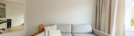 At the front lies the bright living room, characterised by large windows and an open view over the street. At the rear you will find the spacious kitchen, with ample room for a dining table. From here, doors open onto the east-facing balcony – an ideal spot to enjoy the morning sun. The adjacent bedroom also provides direct access to the balcony through French doors, creating a seamless connection between indoors and outdoors. A second bedroom at the front is flexible in use, perfectly suited as a study, children’s room, or guest bedroom. The bathroom is fitted with a shower, toilet, and a waterproof built-in Bowers & Wilkins speaker.