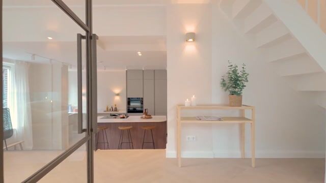 Through a private entrance on the street side and a steel-look porch, you reach the living area of the property, the living room, where large windows provide pleasant light and a nice connection with the surroundings. At the rear of the house is the spacious kitchen, which you reach by going down a few steps. A charming difference in height that immediately creates atmosphere. The modern kitchen has a central cooking island with a round top that elegantly continues into a bar. The space is equipped with an induction hob with internal extraction, dishwasher, oven, full-size refrigerator and freezer, climate cabinet, and sink with Quooker. Thanks to the generous layout, there is plenty of room for cooking and dining; the cozy dining room is directly connected to the cooking area. From the kitchen, there is access to the backyard, located at the quiet rear, where there is plenty of space for relaxing and outdoor dining. There is also a separate toilet on this floor.