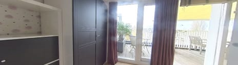 The internal staircase leads to the top floor. From the landing, several French doors lead directly onto the large sun terrace of over 18 m². This terrace also faces southwest, offers plenty of privacy, and has a large awning: a fantastic place to sit in the sun after work or spend long summer evenings at a long dining table. There are two more bedrooms here, both of a comfortable size. The second bathroom is equipped with a shower, toilet, and sink. This bathroom also has a stylish black cast floor (terrazzo).
