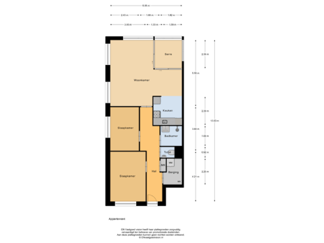 Via the communal staircase, you take the elevator to the first floor, where the apartment is located. Upon entering, you will find a long hallway providing access to all rooms. On the left-hand side are the two well-sized bedrooms.