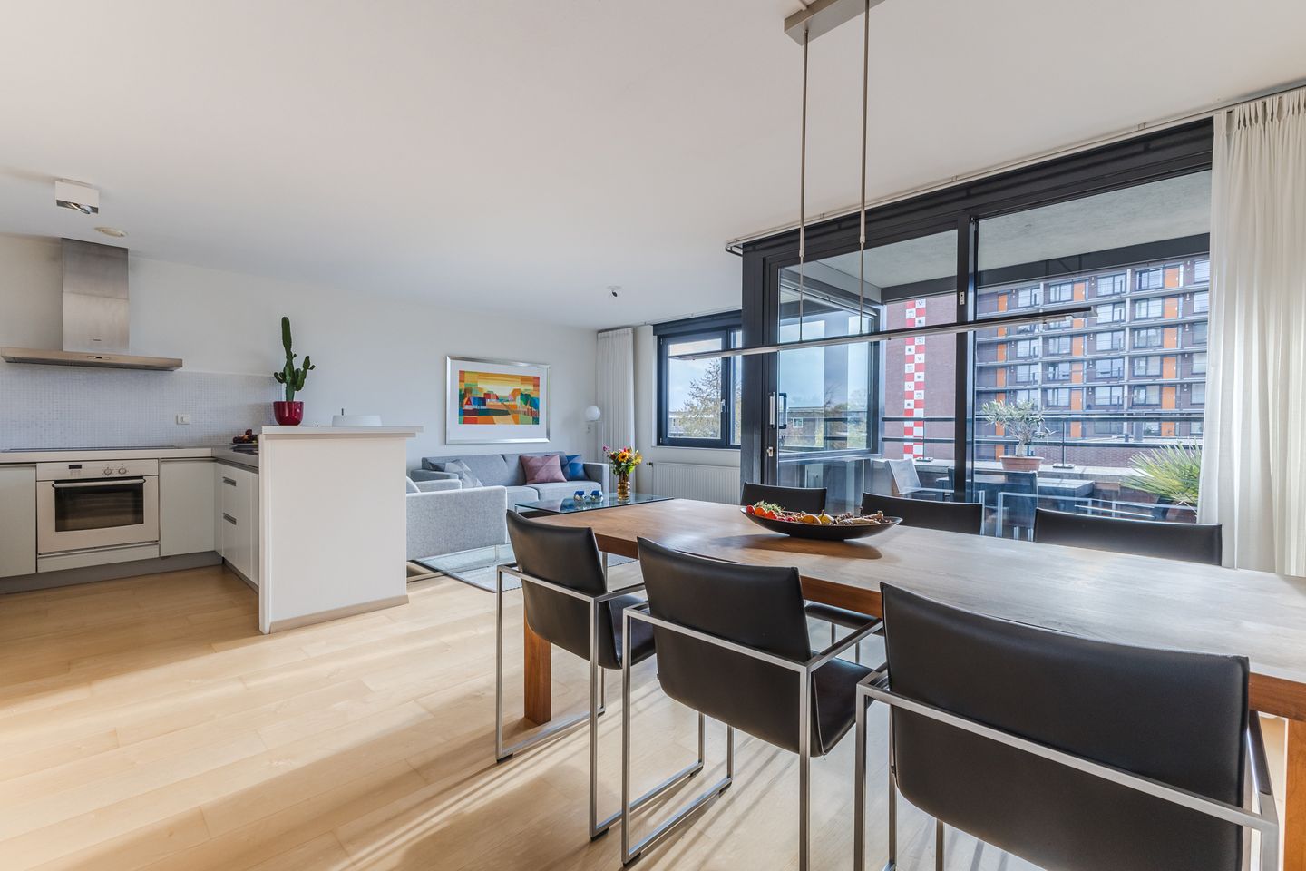 Upon entering, you arrive in the hallway, which provides access to all rooms. The apartment is finished in a clean and well-maintained style with smooth plastered walls and features a spacious living room with open kitchen. Thanks to the large windows and the south-facing orientation, the living area is pleasantly bright and spacious. The indoor balcony is directly connected to the living room via a sliding door, forming a natural extension of the living space, where you can enjoy the sun from approximately 1:00 PM until sunset.