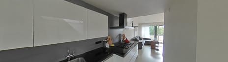 Upon entering, you'll be immediately amazed by the generous amount of natural light through the large sliding doors and windows. Due to the sunny location, a sunshade spans the entire width of the living room. The spacious, bright living room (approx. 30 m2) has a high ceiling (from 240 to 370 cm), which gives the room an extra sense of space.