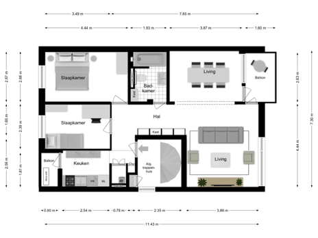 The living room spans the full width of the building. Large windows draw in light from both sides, while the soft colours, thoughtful lines, and serene decor create a subdued atmosphere. At the rear, connected to the balcony, the view unfolds: greenery, water, silence. At the front: a sheltered balcony with a black-and-white tiled floor, where the air-conditioning unit quietly does its work—unseen in function, felt in comfort. Every room is equipped with air conditioning. Unobtrusive, perfectly regulated.