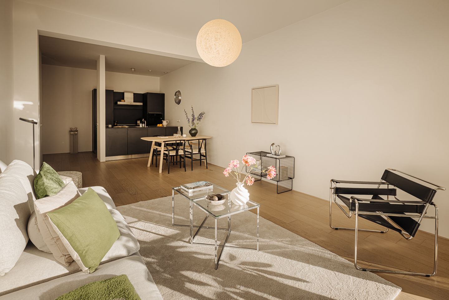 The spacious hall provides access to all rooms and includes a separate toilet and an internal storage room with washing machine and dryer connections. The bright and spacious living room forms the heart of the home and is openly connected to the luxury kitchen, equipped with various built-in appliances including an induction cooktop, dishwasher, fridge-freezer, combination oven, and extractor hood. Thanks to the high ceilings of approx. 2.96 meters and the large floor-to-ceiling windows, the rooms feel bright and comfortable. The generous bedroom adjoins the west-facing balcony of approx. 5 m²—an ideal spot to enjoy the afternoon and evening sun. The luxurious bathroom features a bathtub, walk-in shower, stylish washbasin unit, and a second toilet.