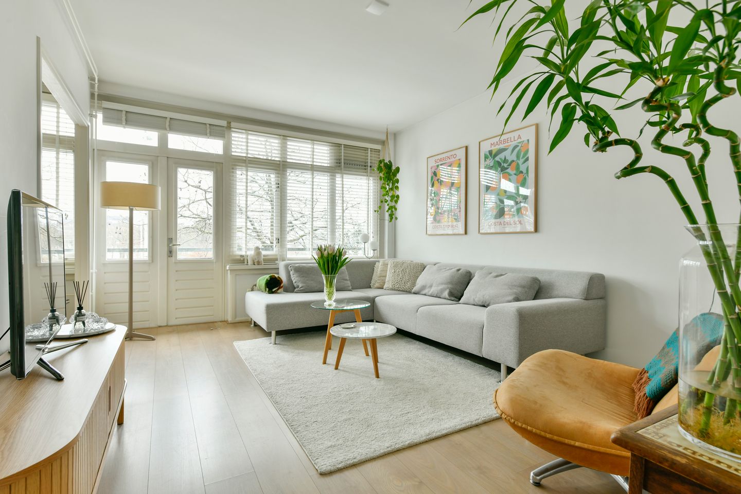 Upon entering, you step directly into the hall with a cloakroom, which provides access to all rooms. The entire apartment has neat laminate flooring in wide wood-look strips. What stands out is the fresh style of the interior, and it is clear that the current owner has put a lot of love into it. Or perhaps it is due to the remote-controlled air conditioning that it feels like coming home here during every season!