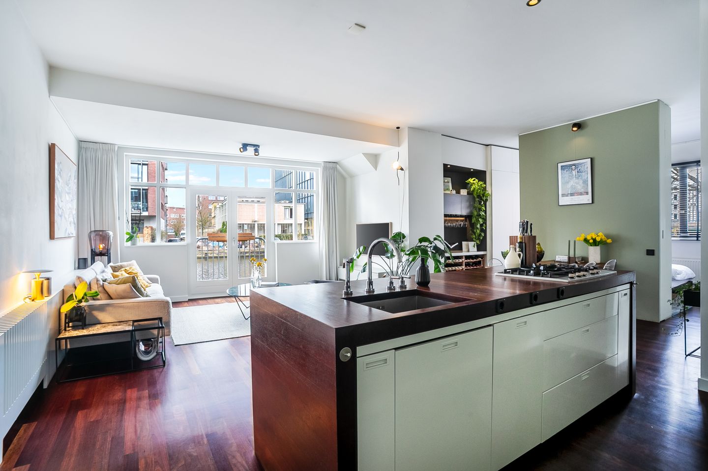 The property is located on the ground floor and is accessible via the communal hallway. Upon entering, the hallway provides access to the cloakroom, a laundry room, a storage room, the bathroom, and the first bedroom. The spacious, modern bathroom was tastefully renovated in 2022 and features a walk-in shower, toilet, and a double sink with cabinetry. From the hallway, you also reach the beautiful living room with a luxurious open kitchen. The high ceilings combined with the large wooden doors and (purpleheart) wooden floor give this space a unique character. When the doors are open, the French balcony offers a stunning view over the Kostverlorenvaart. In the summer, you can enjoy swimming here and watching the pleasure boats pass by! The kitchen is architecturally designed and equipped with a cooking and rinsing island, refrigerator, Siemens steam oven, a compact dishwasher, and a built-in niche for all small kitchen appliances. Adjacent to the living room is the second spacious bedroom, featuring a very large custom-made built-in wardrobe from floor to ceiling. This bedroom can be closed off from the living room with beautiful sliding doors, and when they are open, extra light floods into the living room.