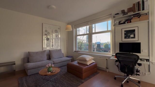 This charming upstairs apartment is located in a quiet spot in the popular Frederik Hendrikbuurt neighborhood, spread over several floors and featuring a lovely roof terrace. You reach the entrance to the apartment via the shared stairwell. You enter on the second floor and via your own staircase you step right into this unique apartment! Immediately upon entering, you will be surprised by the fantastic light and the view of the De Otter windmill — a special part of Amsterdam that will make you smile every day. The layout is practical and attractive, creating a spacious sitting and dining area with ease.