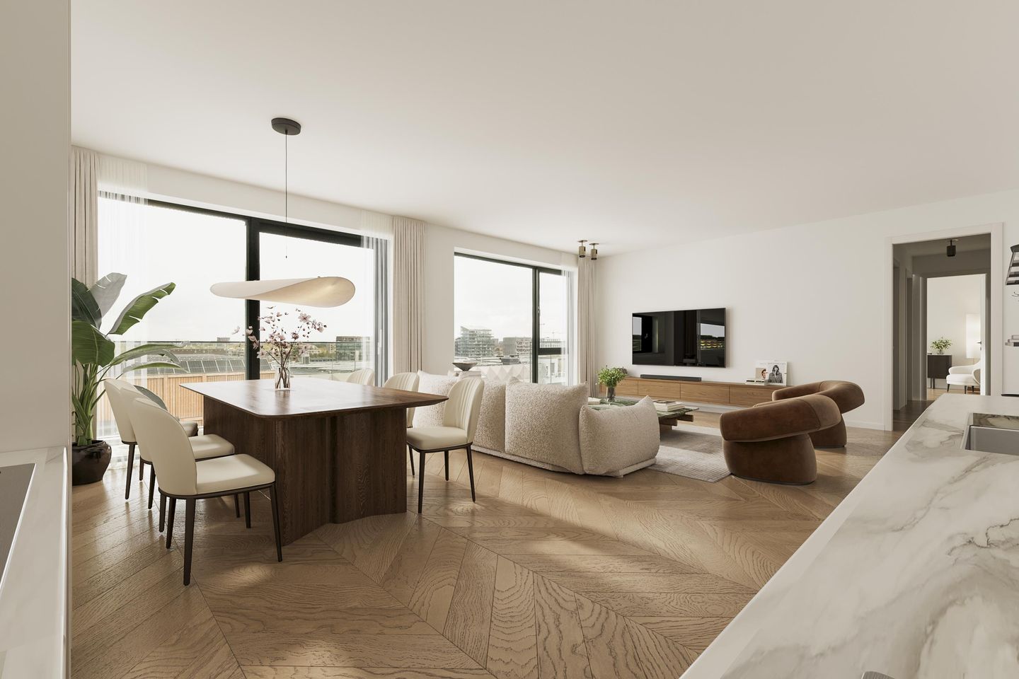 THIS. consists of 69 owner-occupied apartments, varying from studios and apartments to a generous penthouse. Living areas range from approximately 38 m² to around 200 m². The diversity of homes offers something for everyone, from compact starter apartments to spacious family homes and an exclusive penthouse with magnificent views.