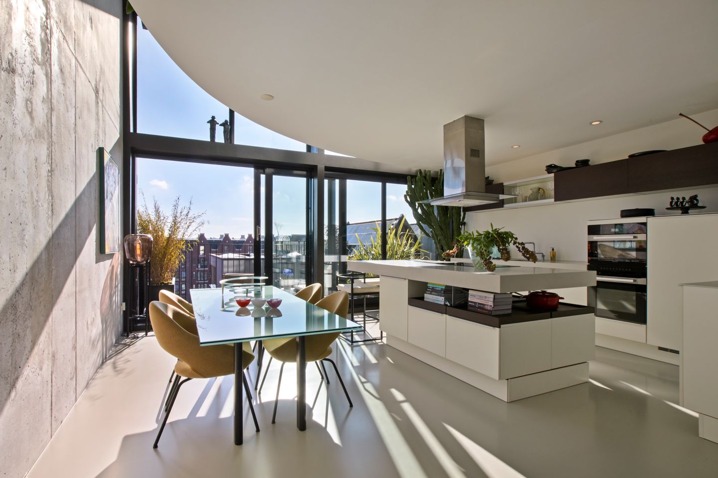 This beautiful home has a unique layout and luxurious finish, giving it a serene and tasteful appearance. Particularly noteworthy are the floor-to-ceiling windows providing excellent natural light and multiple views over the IJ and the city. Also striking are the elegant and organic design, the glass platform on the upper level overlooking the living area below, and the long robust concrete wall running the entire length of the apartment. Finally, the third floor features a beautiful poured floor with underfloor heating, floor cooling, and automatic sun shading. The sunny terrace completes this apartment.