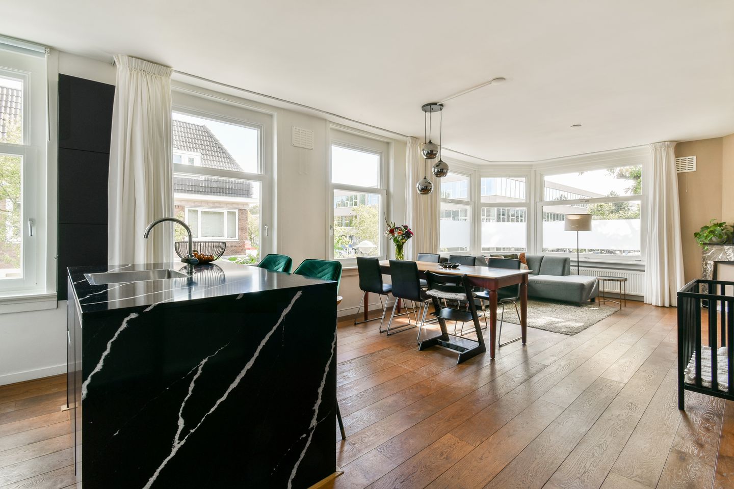 De ruime woonkamer, met open keuken en kookeiland met bar, is dankzij de hoekligging voorzien van veel ramen, waardoor er een overvloed aan licht naar binnen valt. Dit maakt de living een heerlijk open en sfeervolle plek om te verblijven.