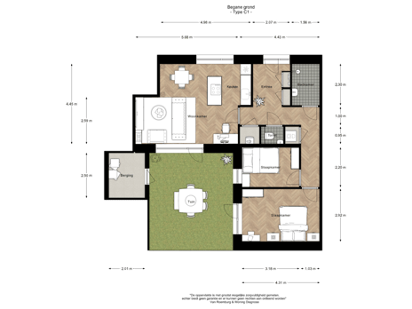 De verkoopinformatie is met grote zorgvuldigheid samengesteld doch voor de juistheid van de inhoud kunnen wij niet instaan en er kunnen derhalve geen rechten aan worden ontleend. De inhoud is puur informatief en mag niet worden beschouwd als een aanbod. Daar waar gesproken wordt over inhoud, oppervlakten of afmetingen moeten deze worden beschouwd als indicatief en als circa maten. Aangezien het nieuwbouw betreft, zijn de opgegeven m2 niet conform de Meetinstructie Gebruiksoppervlakte woningen van de NVM, maar zijn conform opgave architect. U dient als koper zelfonderzoek te verrichten naar zaken die voor u van belang zijn. Wij raden u in dat verband aan uw eigen (NVM-)makelaar in te schakelen.
