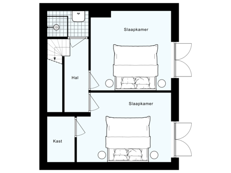 The other two spacious bedrooms with separate bathroom are accessible via the staircase downstairs. Both rooms provide access to the garden located on the northeast.