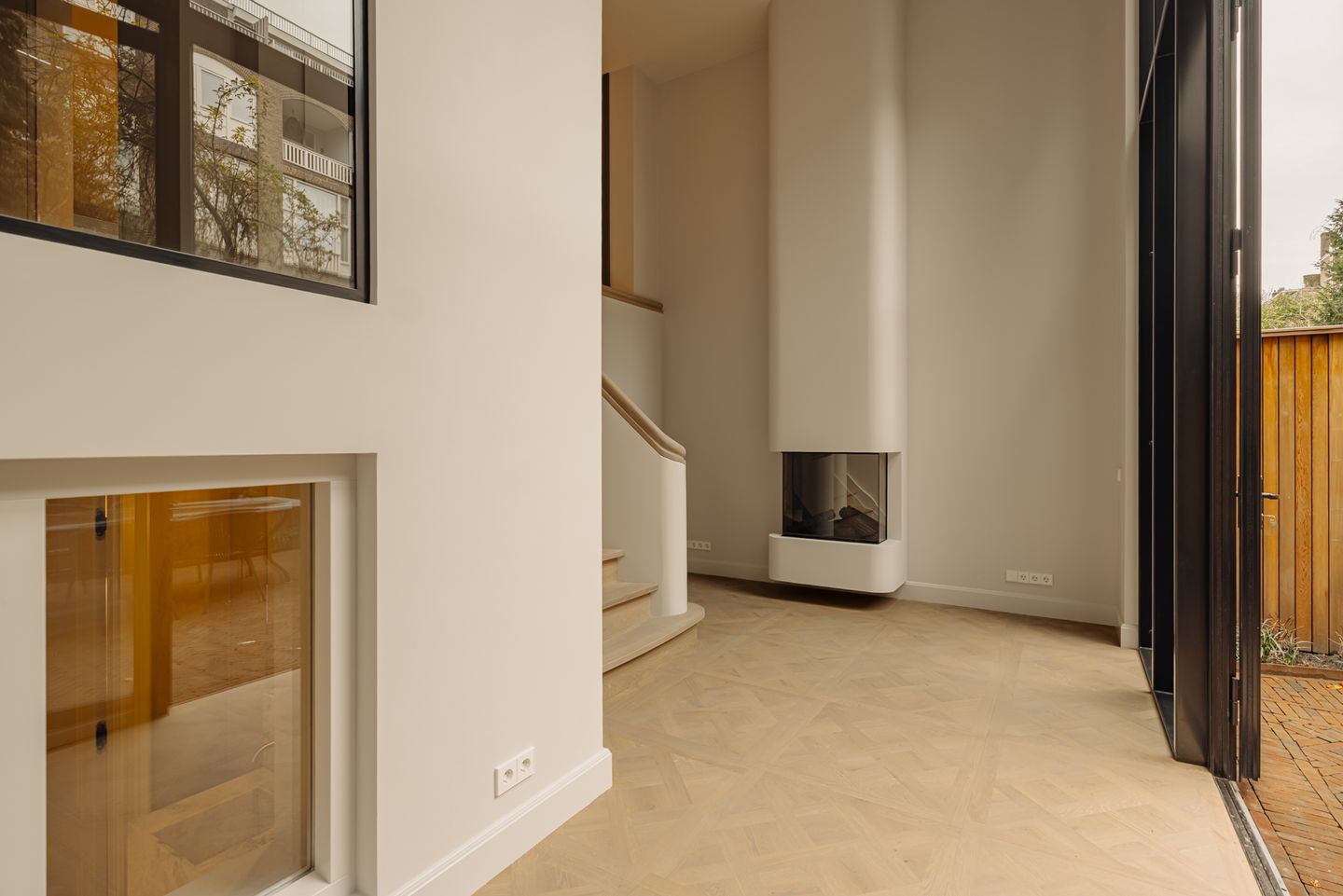 This high-quality renovated residence is spread over multiple levels and combines a clear layout with an abundance of light and space. On the bel-etage (upper ground floor), the living room is positioned at the front, while a centrally located, bespoke kitchen with cooking island and full-height cabinetry forms the heart of the home. Large windows provide pleasant daylight and an open atmosphere. The sleeping floors are efficiently arranged and offer several bedrooms suitable for various uses, such as sleeping, working, or hosting guests. The bathrooms feature custom-made cabinetry, natural stone worktops, and walk-in showers; one bathroom also includes a freestanding bathtub. The souterrain connects directly to the rear garden through tall glass doors. The garden is low-maintenance, offers ample privacy and space for a dining table or seating area, and functions as a practical extension of the living space.